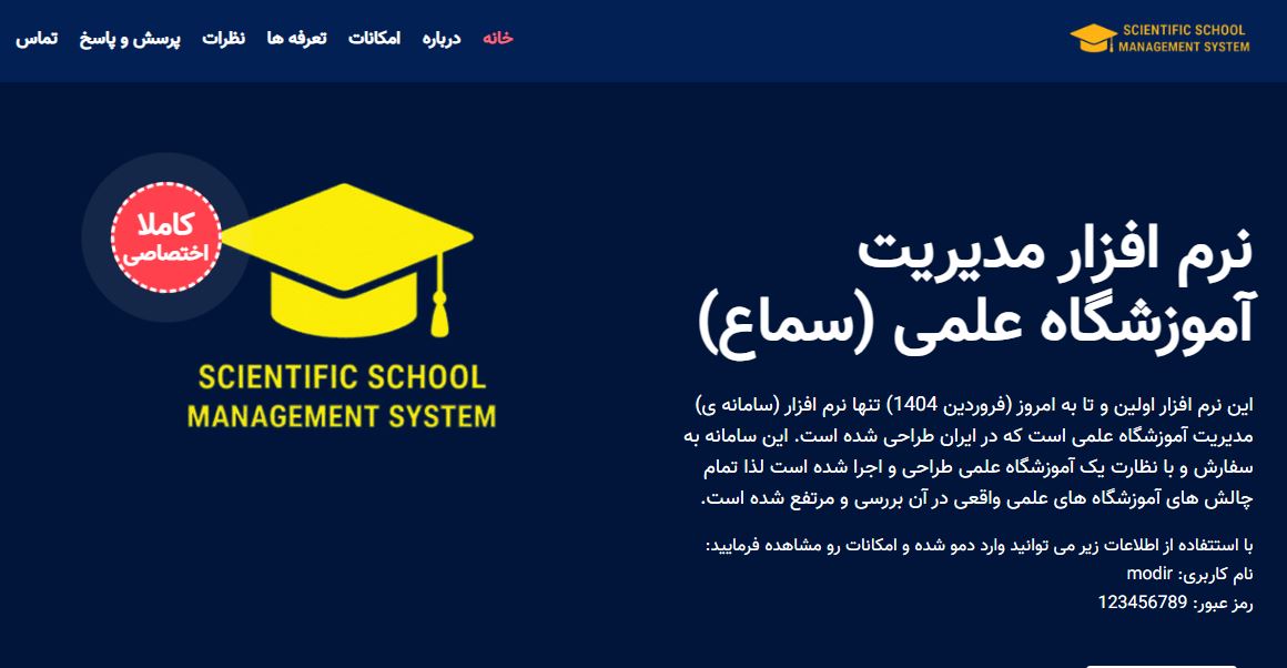 سامانه ی مدیریت آموزشگاه علمی، سامانه ای است که بر اساس تجربه ی 18 سال همکاری با موسسات آموزشی و آموزشگاه ها، طراحی شده است. آموزشگاه های علمی مراکزی هستند که خدمات آموزشی را به دانش آموزان متقاضی ارائه می کنند. این خدمات اغلب مواقع توسط دبیرانی خارج از مجموعه ارائه می شود. یعنی آموزشگاه واسطه ای بین دبیران و دانش آموزان است. این سامانه با شناخت مشکلات و پیچیدگی های این شغل، مدیریت آموزشگاه را تسهیل می کند.