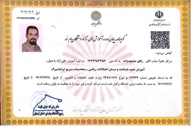 در دوره ی آموزش نحوه شناخت و درمان اختلالات ریاضی به مدت 10 ساعت در دانشگاه پیام نور شرکت کرده و موفق به اخذ گواهینامه ی پایان دوره از سوی وزارت علوم، تحقیقات و فناوری شدم.